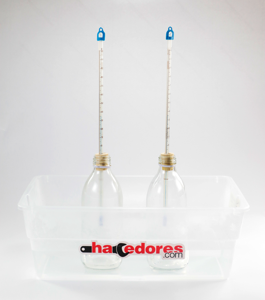 2.Introduce las dos botellas en el recipiente con agua caliente, esto va a simular el calor que irradia el Sol, después de algunos segundos comenzará el aumento de temperatura en las botellas, notarás también que la botella con CO2 es la que aumenta más su temperatura.