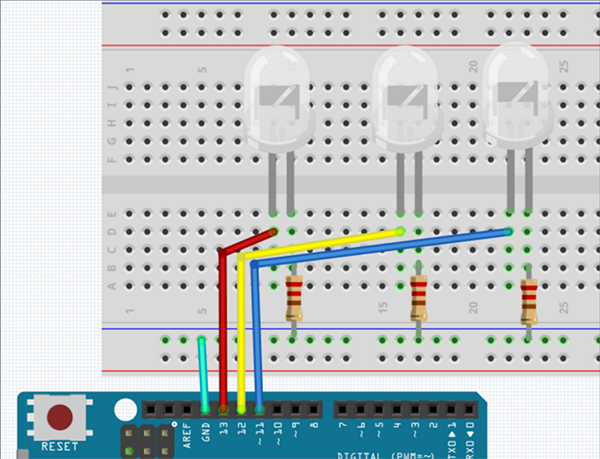 El objetivo de la actividad es repasar el concepto de condicional IF y el envío de datos desde la computadora al Arduino, tenemos tres LEDs conectados a pines diferentes del Arduino y enviando diferentes caracteres al Arduino por medio del puerto Serial podremos prender o apagar cada uno de manera independiente.