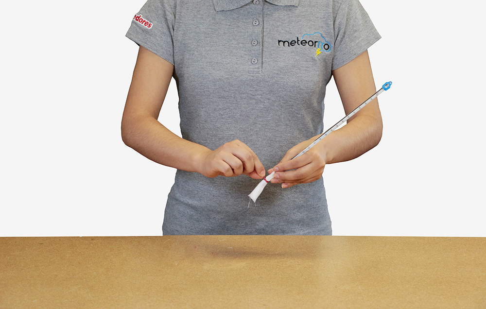 1.Pon un poco de agua en la tapa de refresco y humedece la gasa del termómetro (ayúdate con la jeringa).