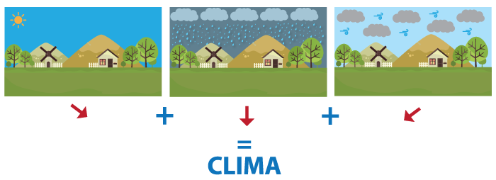 Es importante diferenciar estos dos términos, el clima es el estado medio de los elementos meteorológicos de una localidad considerando un largo período de tiempo (superior a 30 años). Determinado por los factores climatológicos: latitud, longitud, altitud y orografía. Mientras que el estado del tiempo se utiliza para designar a la variedad de fenómenos que se suceden en la atmósfera en un momento y lugar determinados.