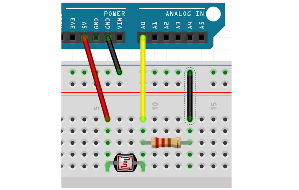 1. Realiza el montaje de la resistencia LDR y la resistencia de 100 KOhms en la protoboard, de acuerdo al siguiente diagrama, aquí emplearemos los jumpers, la LDR y la resistencia.