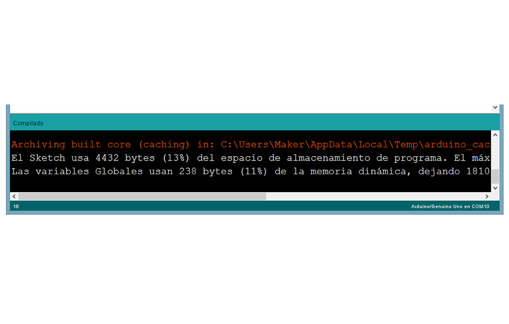 7.Da click en el icono de subir, para cargar el programa en Arduino, si todo sale bien, aparecerá un mensaje como este en la consola.