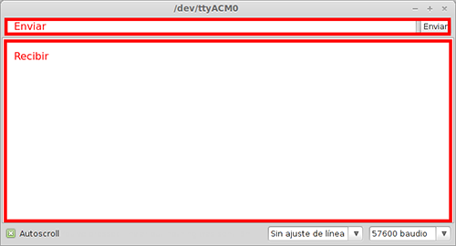 El monitor de puerto serie es una pequeña utilidad integrada dentro de IDE Standard que nos permite enviar y recibir fácilmente información a través del puerto serie. Su uso es muy sencillo y dispone de dos zonas, una que muestra los datos recibidos y otra para enviarlos. Estas zonas se muestran en la siguiente imagen: