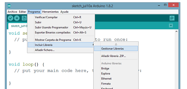 Arduino nos da la posibilidad de instalar librerías desde la aplicación, en la barra superior, en Programa, en la sección de Incluir Librería, nos despliega la opción de gestionar librerías (requiere de una conexión de internet).