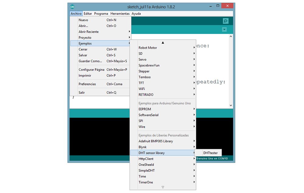 1.Verifica que la librería del sensor de temperatura “DHT sensor” y la librería Adafruit Unified Sensor estén instaladas, de lo contrario instalarlas.